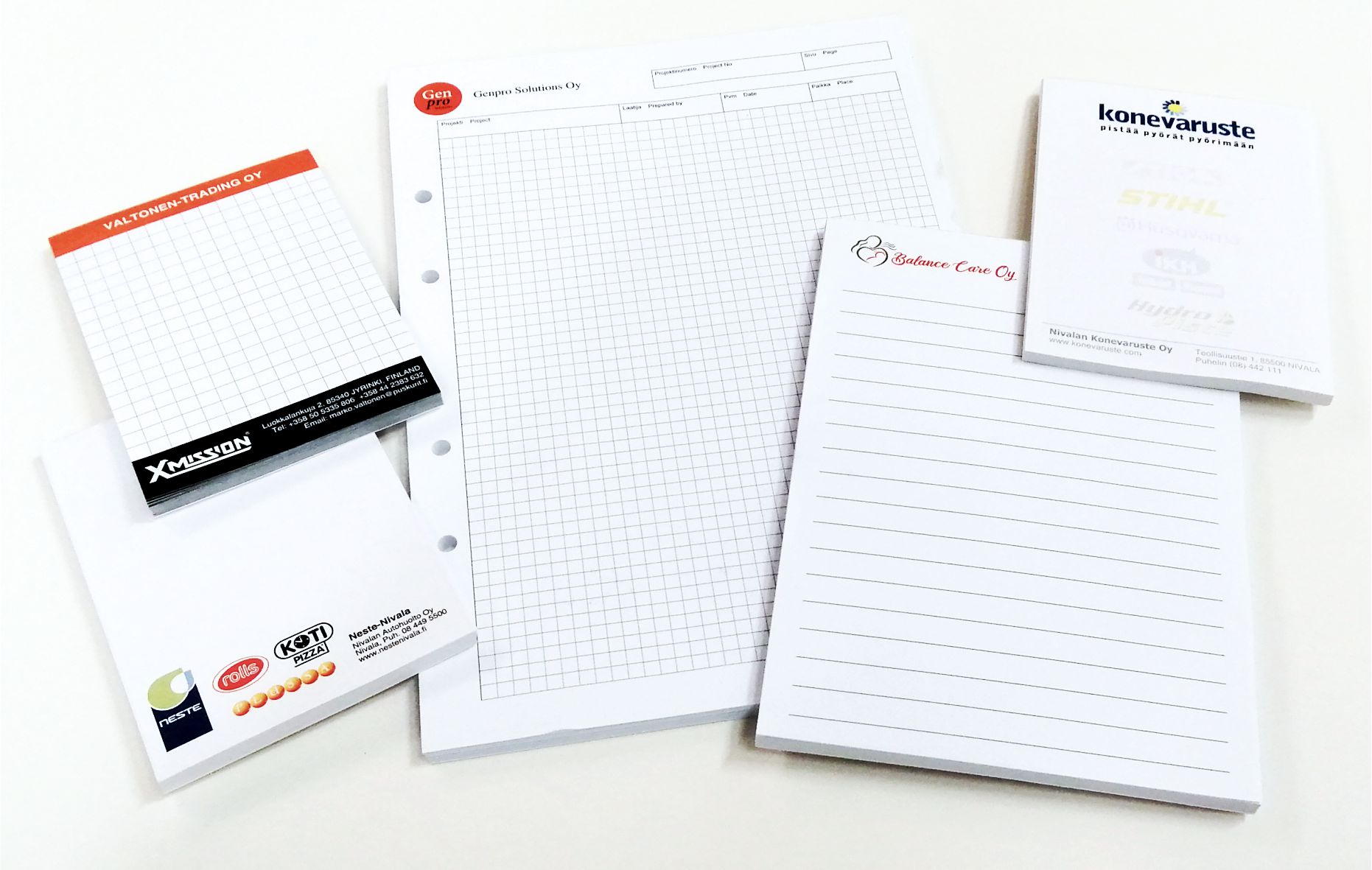 Mainoslehtiöt johon on painettu logonne ja yhteystietonne, on osoittautunut hyväksi mainosvälineeksi. Omassa käytössä se on mainio muistiinpanoväline. Lehtiö on liimattu päästä ja yhdessä lehtiössä on 50 lehteä.